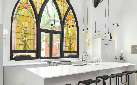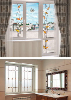 С целью изготовления витражей применяется полимерная пленка различных цветов и фактур. Она наносится на стекло. Пластичную оловянную протяжку фиксируют в районе стыков. Таким образом, создаются красивые границы между узорами рисунка. Витраж всегда располагают внутри стеклопакета, между внешним и внутренним стеклами. За счет этого полностью исключается контакт с внешним пространством. Витражные окна служат долго и радуют глаз!